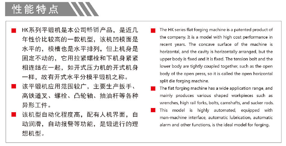 HK系列平鍛機(jī),是近幾年性價比較高的一-款機(jī)型,該機(jī)凹模面是水平的,模槽也是水平排列,但上機(jī)身是固定不動的,它用拉緊螺栓和下機(jī)身緊緊相連結(jié)在一-起,如開式壓力機(jī)的開式機(jī)身-樣,故有開式水平分模平鍛機(jī)之稱。該平鍛機(jī)應(yīng)用范圍較廣,主要生產(chǎn)扳手、高鐵道叉、螺栓、凸輪軸、抽油桿等各種異形工件。